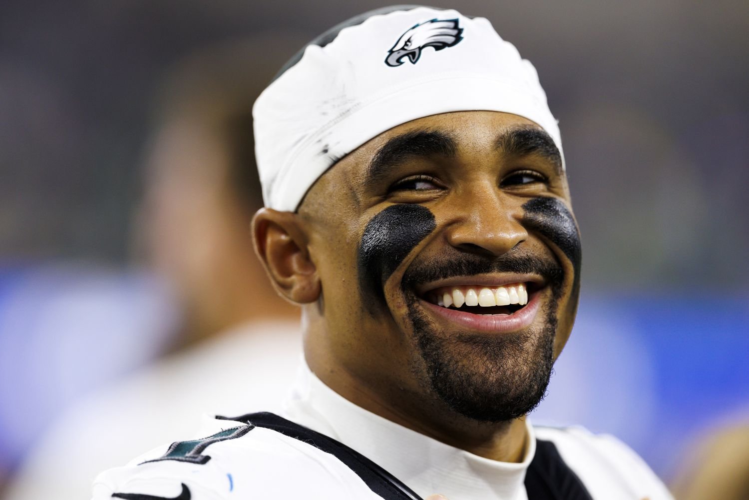 Earlier than the large sport, Hurts smiled his approach via the season, together with on this Nov. 2024 shot, taken forward of the match towards the Los Angeles Rams.