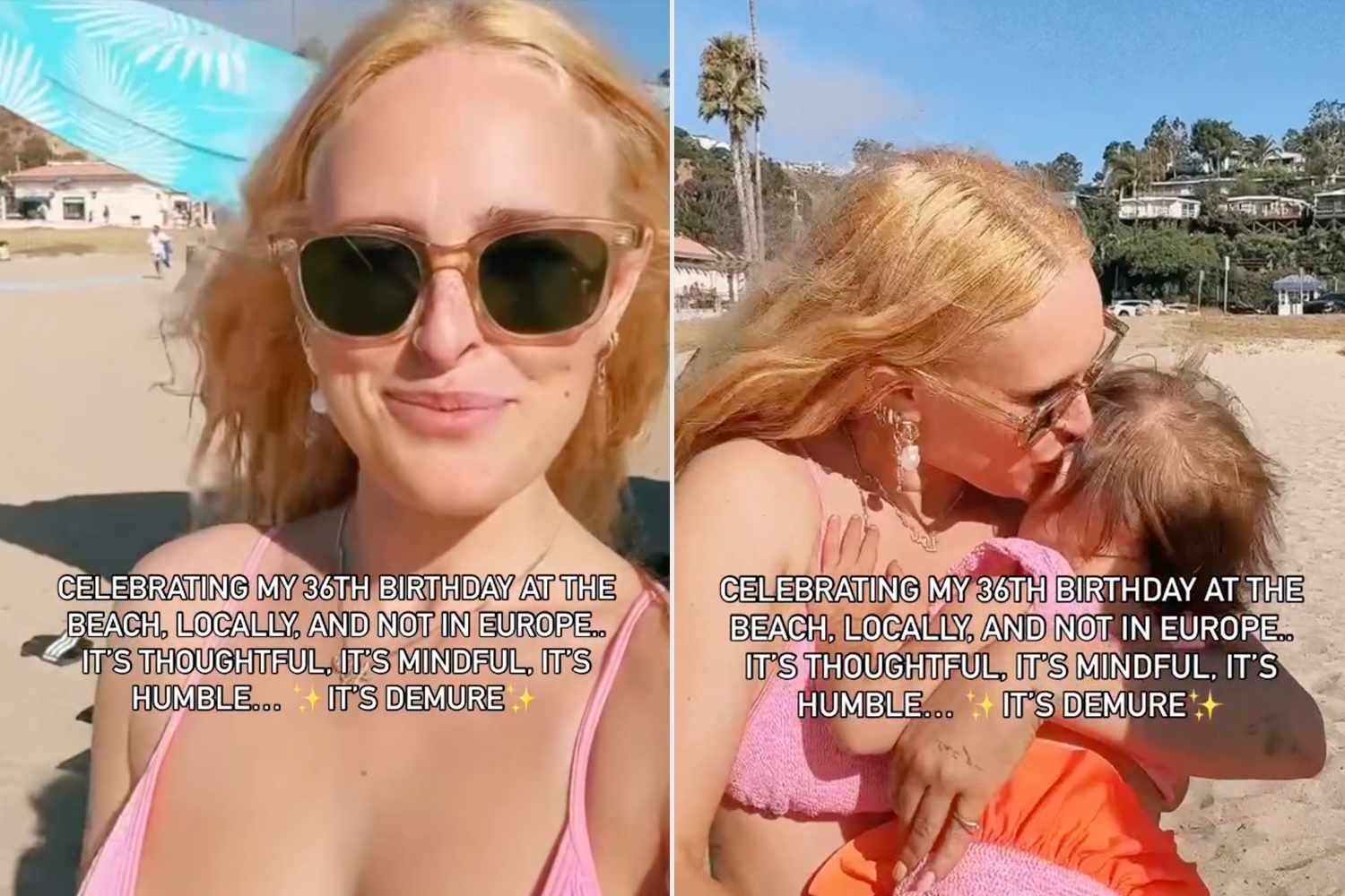 “CELEBRATING MY 36TH BIRTHDAY AT THE BEACH. LOCALLY, AND NOT IN EUROPE..,” she wrote alongside the clip. “IT’S THOUGHTFUL. IT’S MINDFUL. IT’S HUMBLE…✨IT’S DEMURE✨.”