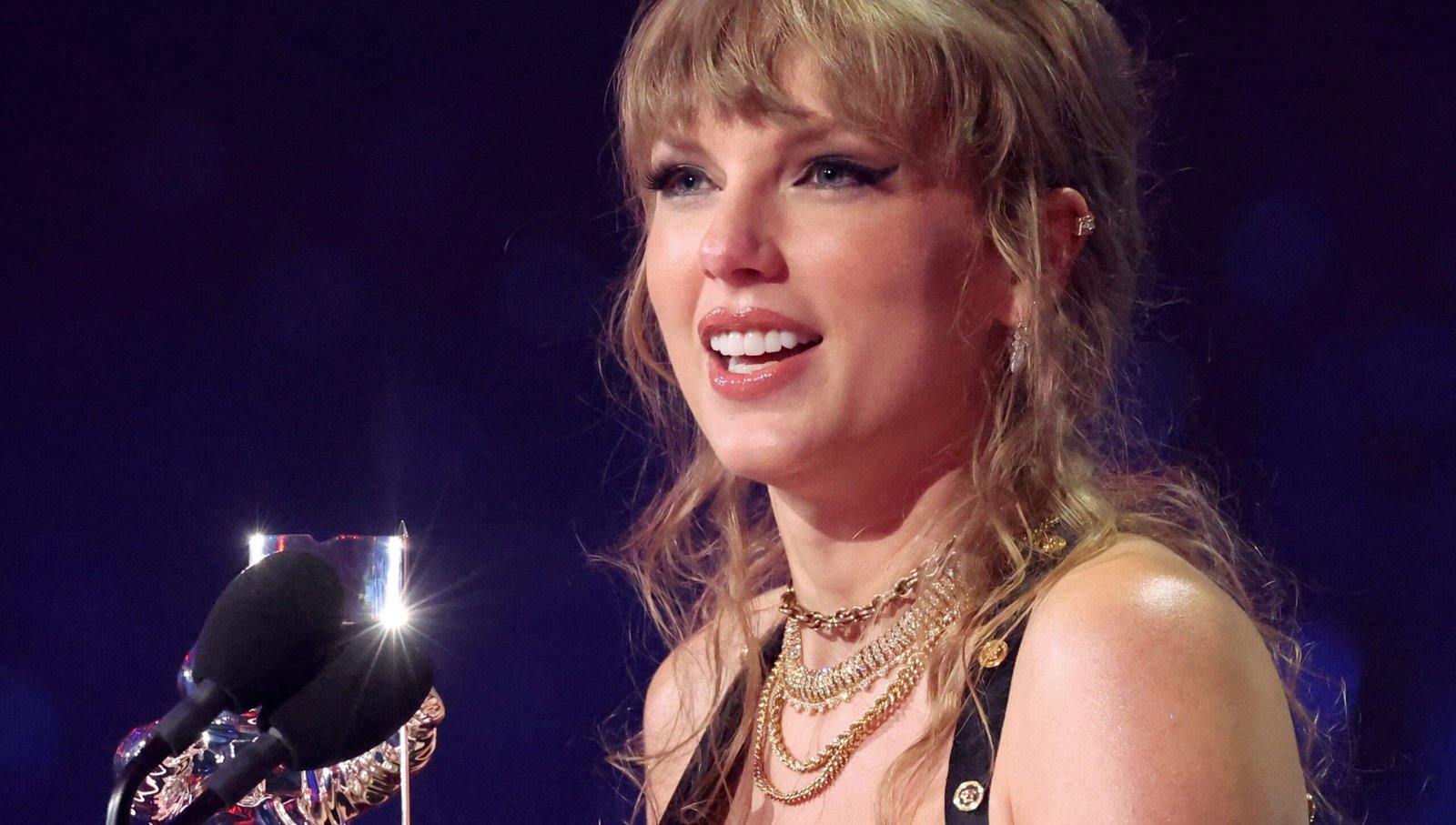 NEWARK, NEW JERSEY - SEPTEMBER 12: Taylor Swift accepts the Best Pop award for "Anti-Hero" onstage during the 2023 MTV Video Music Awards at Prudential Center on September 12, 2023 in Newark, New Jersey. (Photo by Mike Coppola/Getty Images for MTV)